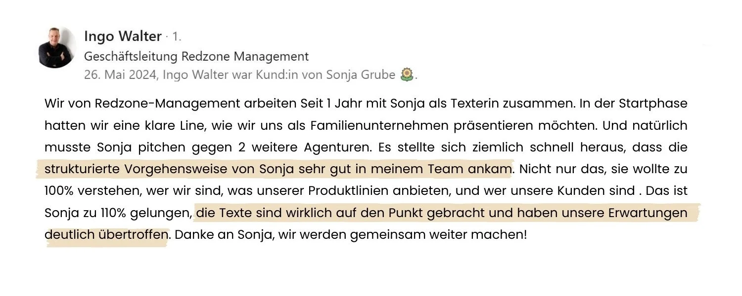 “Sonja hat meine Knoten im Kopf gelöst. Nach der Überarbeitung meiner Über Mich-Seite habe ich prompt einen Neukunden gewonnen.”